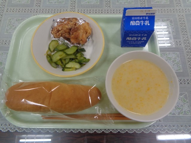 今日の献立は、コッペパン、フライドチキン、アスパラサラダ、コーンポタージュ、牛乳です。