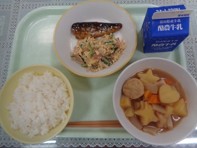今日の献立は、ごはん、いわしの梅煮、ベーコンとゴーヤのたまご炒め、炊き合わせ、牛乳です。
