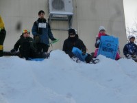 二日目の最初の活動は、しりすべりです。大きな袋をそり代わりにして、雪の坂道を滑...