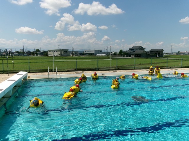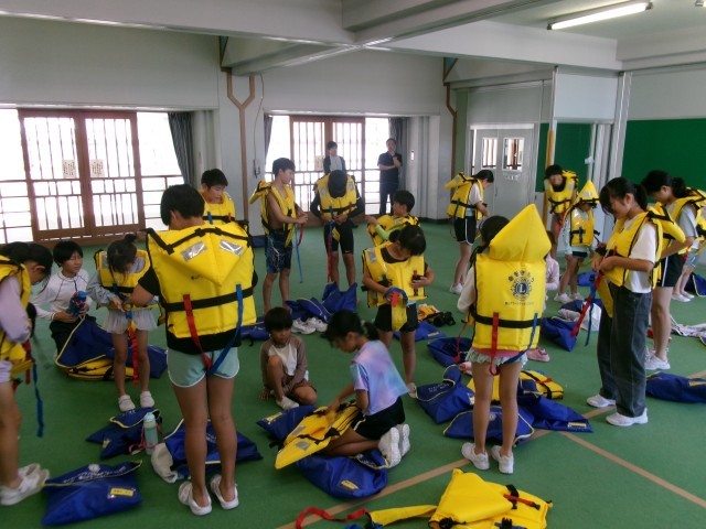 1年生と6年生は、ライフジャケットを使ったプール学習を行いました。最初にライフジャケットの正しい着用方法について確認した後、実際にプールに行き、浮く体験をしました。今日の学習を通して、ライフジャケットの正しい使い方や効果について理解することができました。