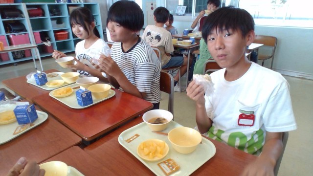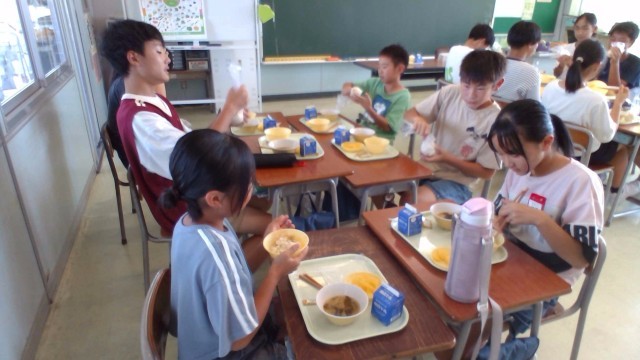 9月1日の「防災の日」にあわせて、防災給食を実施しました。「セルフおにぎり」や「パイン缶詰」等、常温で保存可能な食品を使った献立や、食器をあまり使わない献立を食べる体験を通して、子供たちは防災に対する意識を高めていました。