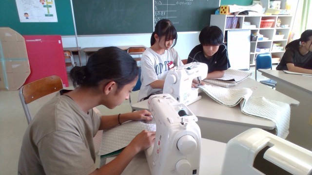 家庭科の時間に「防災頭巾」をつくりました。子供たちは縫う個所をチャコペンで色付けした後、ミシンを使って丁寧に縫っていました。この防災頭巾は、学習発表会の劇で使う予定です。仕上がりが楽しみです。