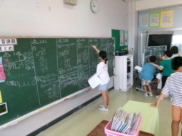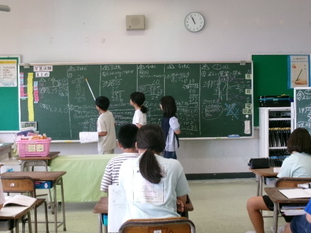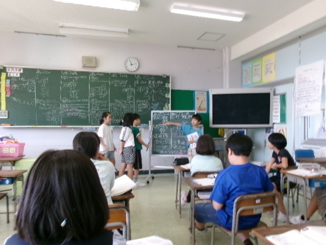 4年生は、算数科「わり算の筆算を考えよう」の学習のまとめを行いました。子どもたちは問題を解いたものをグループごとにで板書し、考え方や解き方を説明しました。