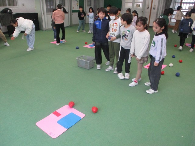 1つ目は、自分たちで的をつくり、的に乗った球の数をたす「お年玉ボッチャ」をしました。