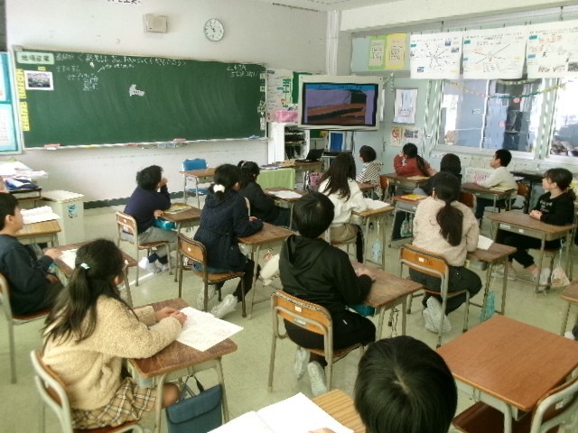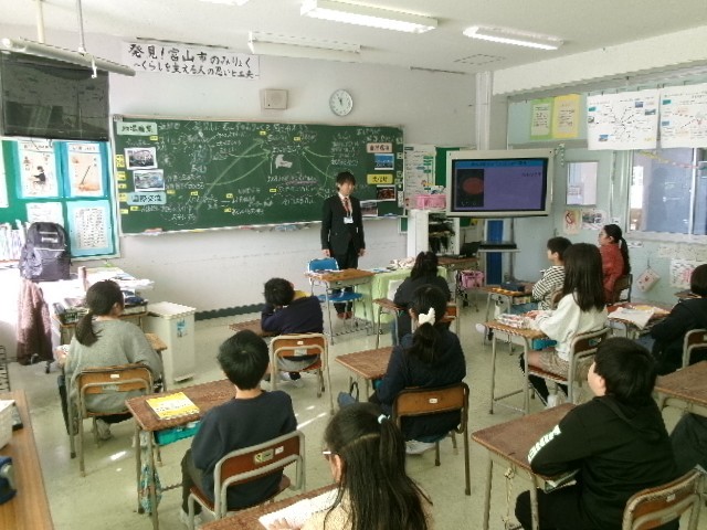 社会科の学習の集大成として、市役所広報課の方をお招きし、富山市の魅力を伝え合うまとめ報告会を行いました。子供たちはこれまでの調べ学習を通して、観光や産業等どの分野にも、豊かなくらしを支える人々の「思い」や「工夫」があることに気付いています。「自分たちにできることは魅力を発信すること。それが富山に住む人を増やすことに繋がるかもしれない」という言葉も聞かれました。
