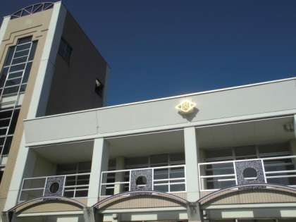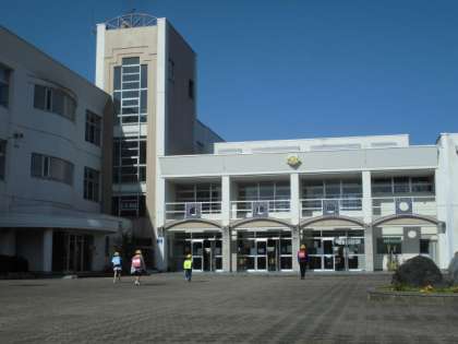雲一つない真っ青な空に、校舎の校章も光り輝いています。気温も高いので、半袖で登校する子もいます。