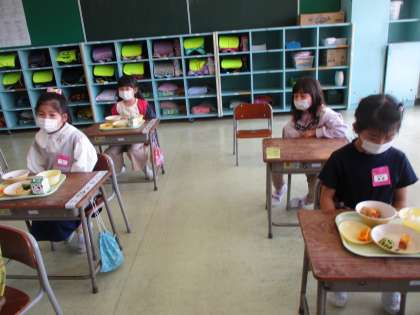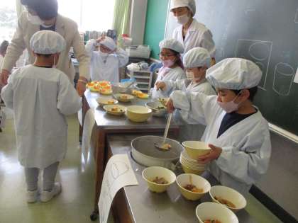 1年生 給食が始まりました 公開日 2022/04/13 更新日 2022/04/13 1年生 今週から給食が始まりました。準備をするグループと静かに待つグループに分かれ、交代で仕事をします。手を洗い、エプロンと帽子を身に付けて、上手に配膳をしました。