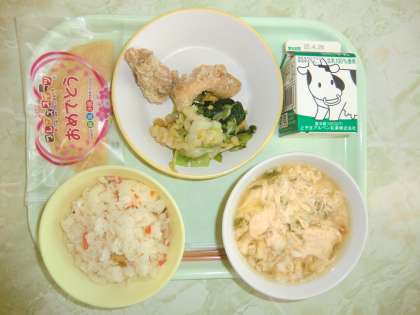 4月21日の給食 公開日 2022/04/21 更新日 2022/04/21 メール用カテゴリ 今日の給食は、 ちらし寿司 牛乳 とりにくのからあげ チンゲンサイひたし かきたまじる おいわいデザート です。 おいしくいただきました。