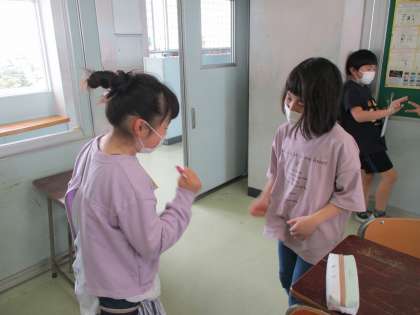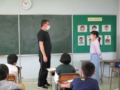 4年生 外国語活動 「自己紹介をしよう」 公開日 2022/04/21 更新日 2022/04/21 4年生 外国語活動の時間に自己紹介をしました。友達に自分の名前や好きなものを伝えました。子供たちは、英語でのやりとりを楽しんでいました。