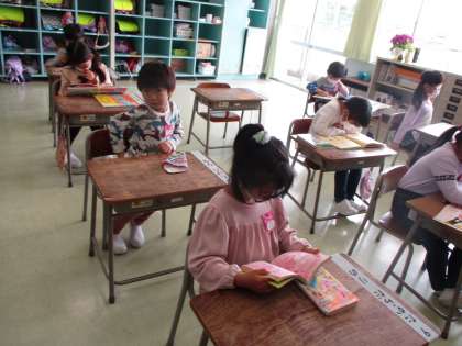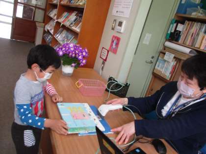 本をカウンターに持って行き、本とバーコードを先生の向きに合わせて、「借ります」と言ってから借りました。たくさん本があるので選ぶのに迷っている子もいました。教室に戻ってからも、本に夢中でした。
