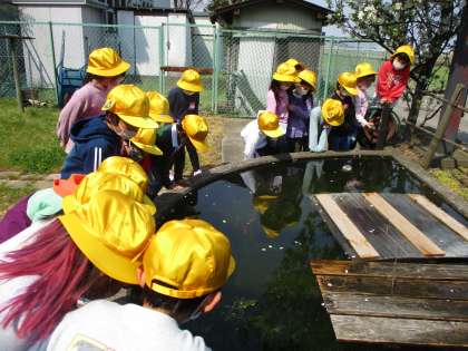 1年生 生活科の学習2 公開日 2022/04/21 更新日 2022/04/21 1年生 誰かが植えて、世話をした花ばかりではありません。ナズナやタンポポ、オオイヌノフグリ等の草花もたくさん見付けました。また、池には金魚がいました。また、小さなカエルが元気よくはねているのも見付けました。身近な自然に触れ、やさしい気持ちになりました。