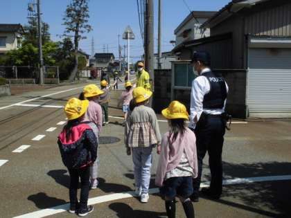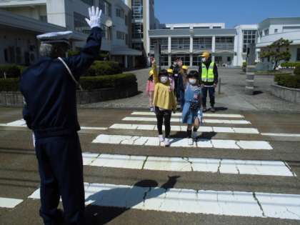 学校周辺の道路を歩き、道路を横断するときの安全確認の仕方を学びました。