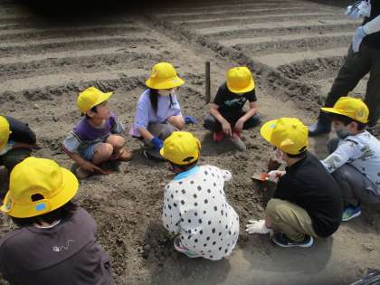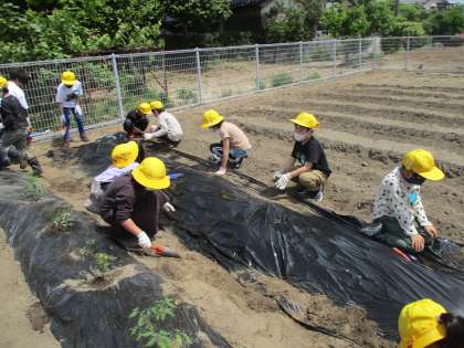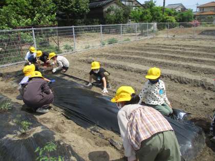 今日は畑の畝に肥料を混ぜ、マルチを貼り、野菜の苗を植えました。子供たちは先に苗を植えた友達にやり方を聞きながら、自分の苗を大事そうに植えていました。