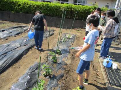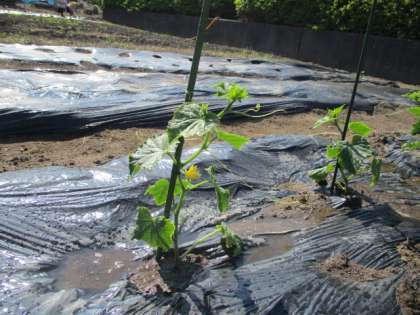 キュウリに黄色い花が咲いているのを見付け、「ここから、実ができるよ」と話し、とてもうれしそうでした。