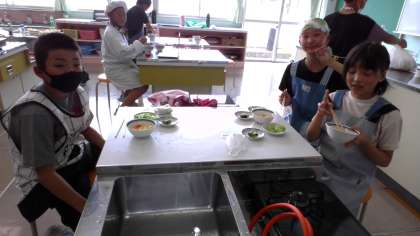 5年生 調理実習 公開日 2022/05/26 更新日 2022/05/26 5年生 茹でる調理に取り組みました。子供たちは一生懸命に調理を進めていました。特に、じゃがいもは食中毒の心配もあることから、丁寧に皮や芽を取り除こうとする子供の姿がありました。 子供たちは工夫して取り組み、振り返りの中では、 「お母さんに『法蓮草を茹でるときは、茎から入れた方がいいよ』と言われたので実践しました。」「人参を食べやすい大きさに切りました。」などの声が聞かれました。
