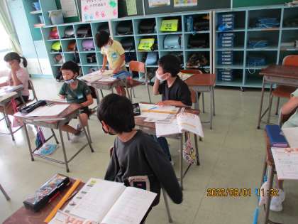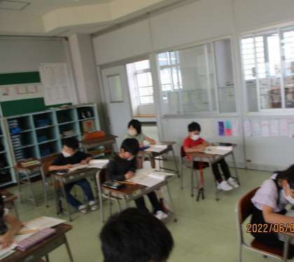先日、算数科の学習で使う竹ものさしを子供たちに配付しました。それを使っていろいろな物の長さを測ったり、直線を書く練習をしたりしています。授業の振り返りでは、「自学でも、いろいろな長さの直線を書きたい」と意欲的に発言していました。