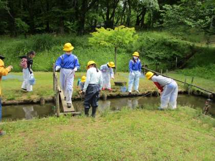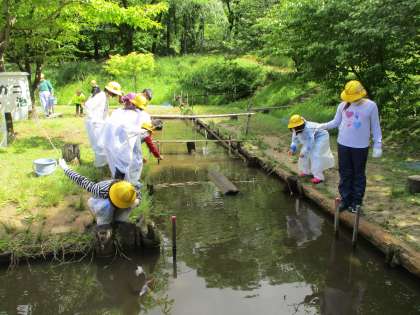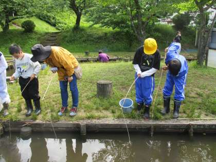 慎重につり上げないと、すぐに逃げてしまうザリガニに悪戦苦闘。真剣なまなざしで取り組んでいました。活動が終わる頃には、バケツにたくさんのザリガニをつることができました。