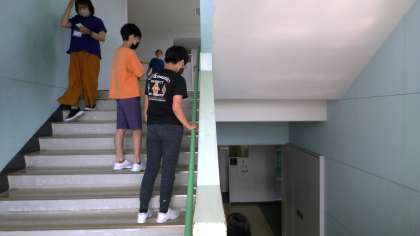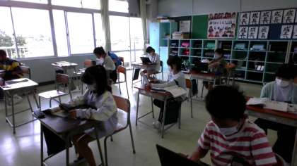 校舎内の工夫や社会の工夫について調べている子供たちの様子です。