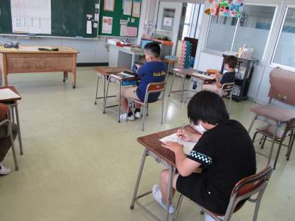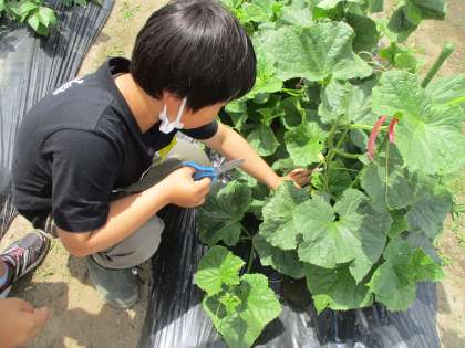 生活単元学習「おいしい野菜を育てよう」では、きゅうりの収穫をしました。2本のきゅうりを収穫することができ、まっすぐなきゅうりと曲がったきゅうりの形のおもしろさから、子供たちは「筆」「しの字」等の名前を付けていました。観察日記には、収穫できた喜びを綴っていました。