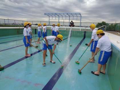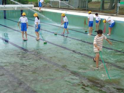 6年生はプールの中の掃除をしました。びしょびしょになりながらも一生懸命床を磨いていました。