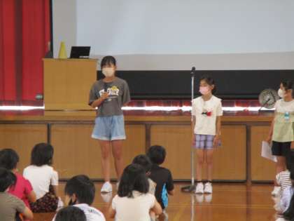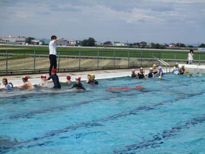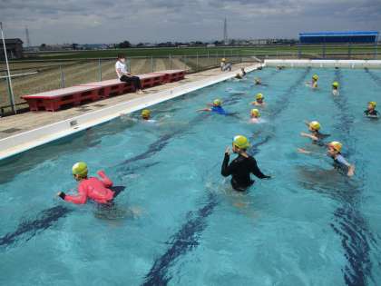 プール開きを行いました。これから始まる水泳学習に向けて、プールでの約束を確認しました。各学年の代表児童が目当てを発表しました。その後、3年生と一緒に入水し、初泳ぎをしました。