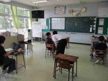 「ようこそ草島小学校」の学習では、新しく草島小学校に来られた先生方にインタビューした内容をクイズにしました。クイズ大会を開くために、クロムブックのスライドを使ってクイズを作成しています。ICT支援の先生にアニメーションの付け方を教えていただき、よりよいスライドに仕上がりました。