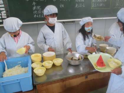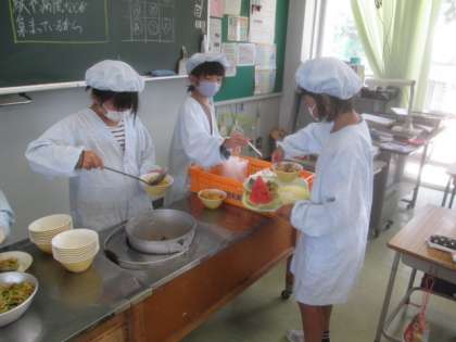 3年生 季節を感じながら味わいました 公開日 2022/07/08 更新日 2022/07/08 3年生 今日も、給食当番が手際よく準備をしています。今日の給食にはスイカが出ました。子供たちは、スイカをおいしそうに頬張っていました。夏を感じながら味わいました。
