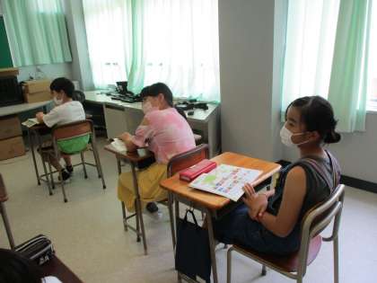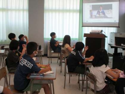ALTと一緒に外国語活動を行いました。今日は、時間の言い方を学習しました。動画を見たり、クイズに答えたりしながら楽しく学びました。