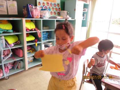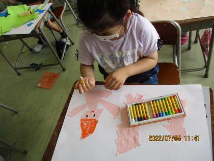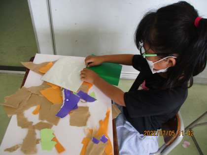 1年生 やぶいたかみのかたちから(図画工作科) 公開日 2022/07/11 更新日 2022/07/11 1年生 紙を破って偶然できた形から、いろいろなものをイメージしました。恐竜の足、船、魚等、何に見えたかを話し合っているだけでも楽しいです。今度はそれを画用紙に貼って、クレヨンで絵に少し描き足しをして、作品に仕上げました。