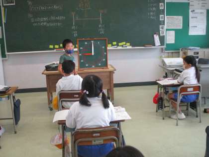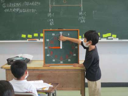 2年生 算数科 「時こくと時間をしらべよう」 公開日 2022/07/19 更新日 2022/07/19 2年生 今日は時刻と時間の違いを学習しました。時計を読むことは得意な子供たちなので、自信をもって時間をもとめる問題に取り組んでいました。