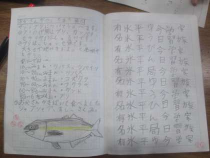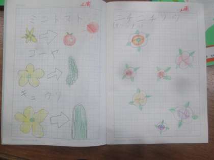 子供たちが家庭でがんばっている自主学習ノートの一部です。家で親が捕ってきた魚に興味がわき、調べまとめてきた子供や身近な花のはなびらと実をわかりやすく描き比較したこどもがいます。子供たちは自分の興味があることなどをまとめること、国語の漢字、算数の計算など幅広く行うことができています。