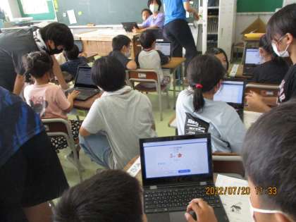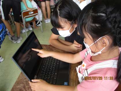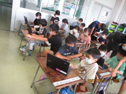 デジタル学習ドリルの問題を解いてみました。パスワードを自分で打った後、いろいろな問題に挑戦しました。6年生のお兄さん、お姉さんがやさしく教えてくれたので、あっという間に開き方や使い方を覚えることができました。