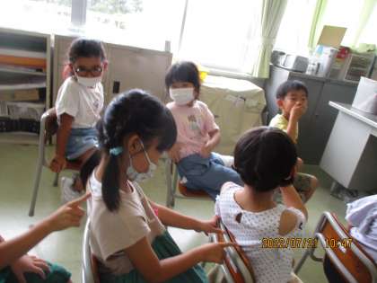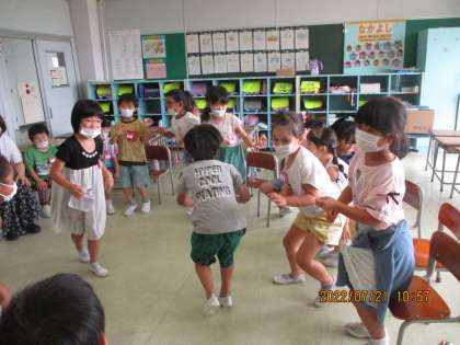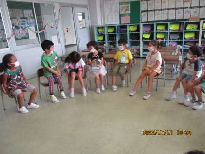 1年生 1学期がんばったね集会 公開日 2022/07/22 更新日 2022/07/22 1年生 1学期にがんばったことをみんなでねぎらい、集会を開きました。1学期の思い出をお題にして「思い出バスケット」(椅子取りゲーム)をしたり、1学期に習ったひらがなを背中に書いて伝言ゲーム(伝文字ゲーム)をしたりしました。夏休みに入るとしばらくの間、会えなくなりますが、とても楽しい思い出になりました。