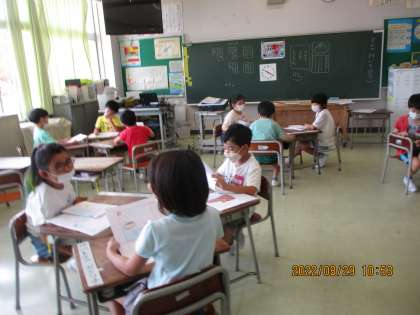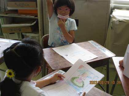 1年生 国語科「ききたいな ともだちのはなし」 公開日 2022/08/29 更新日 2022/08/29 1年生 グループで、夏の思い出の発表をしました。夏休みの絵日記をもとに、詳しく聞きたいこと等を質問しました。メンバーを交代して2回、発表をしました。家族で出かけたことや自然の中で思い切り遊んだことなど、夏ならではの体験に聞き入っていました。
