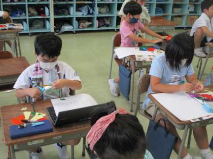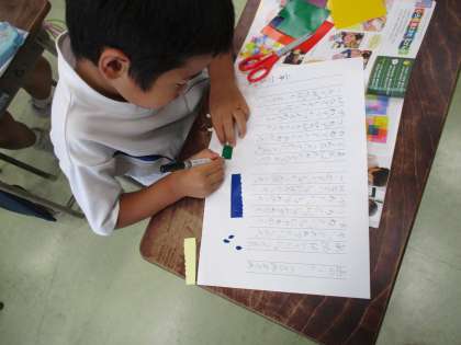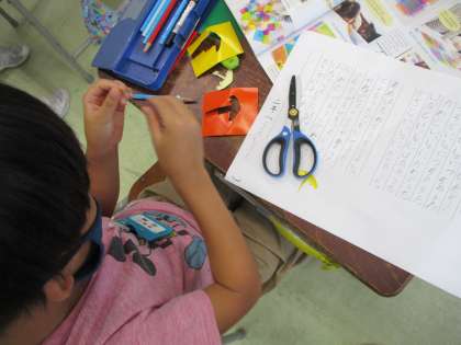 楽しんだ後は、国語科「雨のうた」の学習で視写をした作品に合う模様や飾りにしました。詩に合うように、よく考え、集中して制作していました。