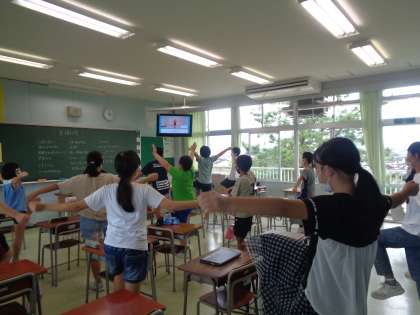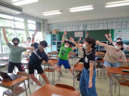 6年生 仕事調べ〜自衛隊〜 公開日 2022/09/02 更新日 2022/09/02 6年生 総合的な学習の時間には、「未来に向かって、今わたしができること」のテーマのもと、職業について調べたり、自分の将来について考えたりしています。 今日は、自衛隊の仕事について調べました。調べている中で見つけた自衛隊体操をみんなでしているところです。訓練の大変さを身をもって少し体験することができました。