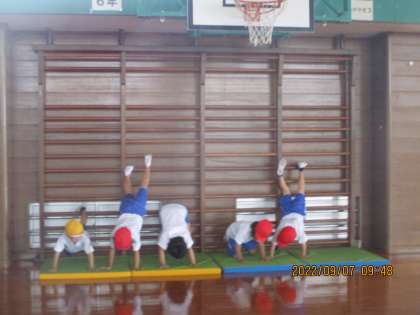1年生 体育科の学習 アスレチックワールド 公開日 2022/09/08 更新日 2022/09/08 1年生 1年生は体育館の肋木、平均台、リング、マット、跳び箱等の器具を使っていろいろな運動に挑戦できるサーキットコースをつくって遊んでいます。最初に先生が考えた基本のコースを改良して、自分たちがもっと楽しく遊べるようにどんどん変化させていきます。今日、自分たちでつくったコースに「アスレチックワールド」というすてきな名前を付けました。 次の体育の時間もとても楽しみにしています。