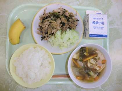 9月9日の給食 公開日 2022/09/09 更新日 2022/09/09 メール用カテゴリ 今日の給食は、 ごはん ぎゅうにゅう ぶたにくのキムチいため ゆでキャベツ くきわかめスープ バナナ です。 今日もおいしくいただきました。