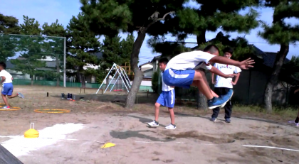 5年生 体育科「走り幅跳び」 公開日 2022/09/16 更新日 2022/09/16 5年生 体育科の学習で走り幅跳びを頑張っています。助走のスピードを生かした踏切や空中姿勢にポイントを定めて取り組んでいます。6年生でのチャレンジ陸上記録会にもつながります。学習の最終には記録会を行います。1cmでも伸びるようにがんばってほしいと思います。