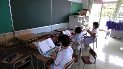 換気や手洗い、消毒をして音楽の学習を進めています。「キリマンジャロ」では、鍵盤ハーモニカとリコーダーのかけ合いを楽しむ様子が見られます。休み時間も、距離を保ちながら演奏を楽しんでいました。