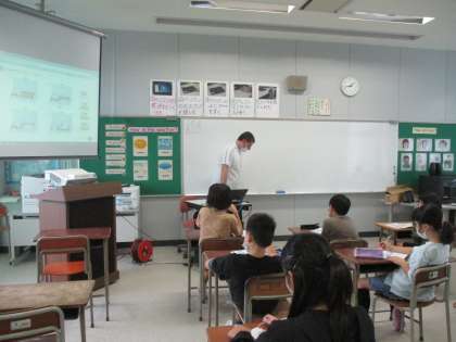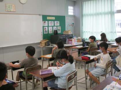 外国語活動では、ALTと一緒に文房具の言い方を学びました。また、動画を見ながら、諸外国の小学校の持ち物について学びました。子供たちは、日本との違いに驚いていました。