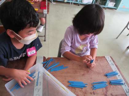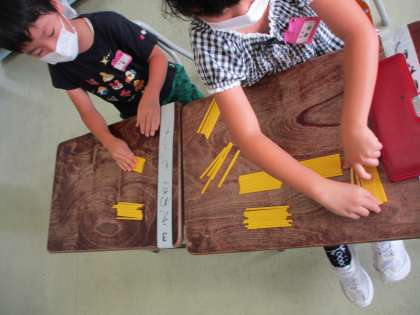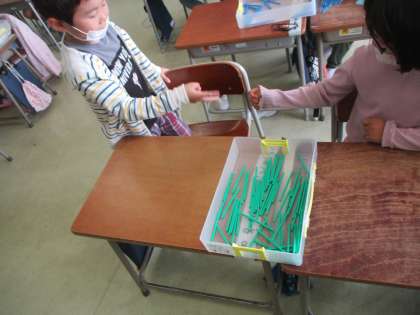 今日は、数え棒のつかみ取りゲームをしました。何本の数え棒をつかんだのかを間違えずに数えるために、10の束を作り、ペアの友達と一緒に数えました。本当に10本の束になっているのかを確認するなど、正確に数えようとするペアもいました。これで40までの数もしっかりと数えることができるようになりました。