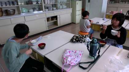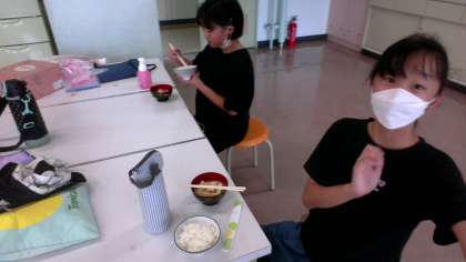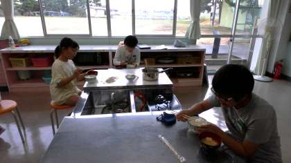 5年生 家庭科 おいしくできました 公開日 2022/09/28 更新日 2022/09/28 5年生 実習で作ったものを試食しました。どの班も鍋で炊くお米の水加減にはらはら、どきどきしていましたが、美味しく炊けて嬉しそうです。距離を保っていただきました。