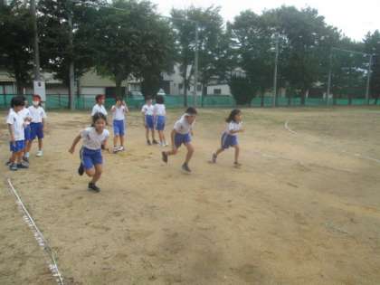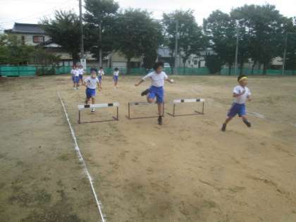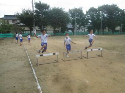 今日は、ハードル走を行いました。はじめは跳ぶことに恐怖を感じていることがありましたが、だんだんとリズムよく5歩で跳ぶことができるようになりました。