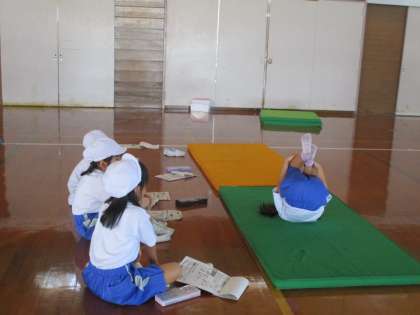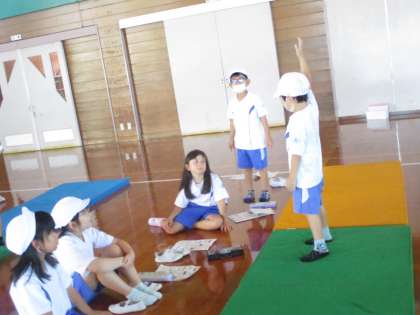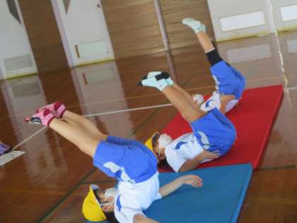体育科の学習で、だるま転がりやゆりかご、川跳び等、マット運動の基本になる技に挑戦しています。学習カードに書かれている技の中から自分が挑戦したい技を選んで練習し、できているかどうかを友達に判定してもらいます。「始めます」「終わります」「どうですか」「どうしてですか」など、挨拶や会話を通して、お互いの技のでき具合を見合う「目」も育ってきています。できなかったことがだんだんできるようになる楽しさも感じています。