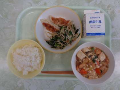 10月6日の給食 公開日 2022/10/06 更新日 2022/10/06 メール用カテゴリ 今日の給食は、 ごはん ぎゅうにゅう やきぎょうざ ナムル えびととうふのうまに です。 今日もおいしくいただきました。
