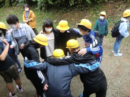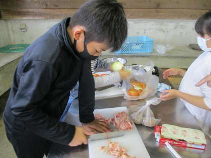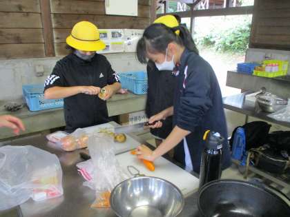 5年生 宿泊学習(野外炊飯) 公開日 2022/10/06 更新日 2022/10/06 5年生 2日目を迎えました。清掃や宿舎の片付け、朝食を済ませ、2日目の中心活動である野外炊飯。カレーライスづくりです。調理実習の成果を発揮できるよう、声をかけ合っていました。中には、円陣を組み、始める班もありました。