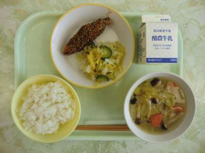 10月11日の給食 公開日 2022/10/11 更新日 2022/10/11 メール用カテゴリ 今日の給食は ごはん ぎゅうにゅう ふくらぎのごまだれがけ あわせあえ ごもくみそしる です。 今日もおいしくいただきました。