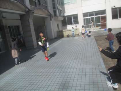 今日の授業は、太陽とかげの関係について学習しました。かげは太陽と反対側にしかできないことを不思議に思い、後ろを向いたり、ジャンプをしてみたりするなど工夫して試していました。晴れた日にかげをしっかり観察することができました。