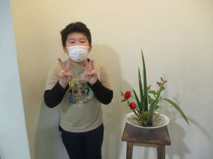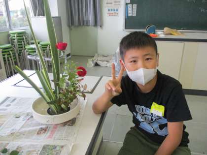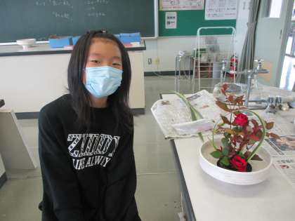 生け花クラブの作品です。バラ等の花材を生かしながら、丁寧に生けることができました。